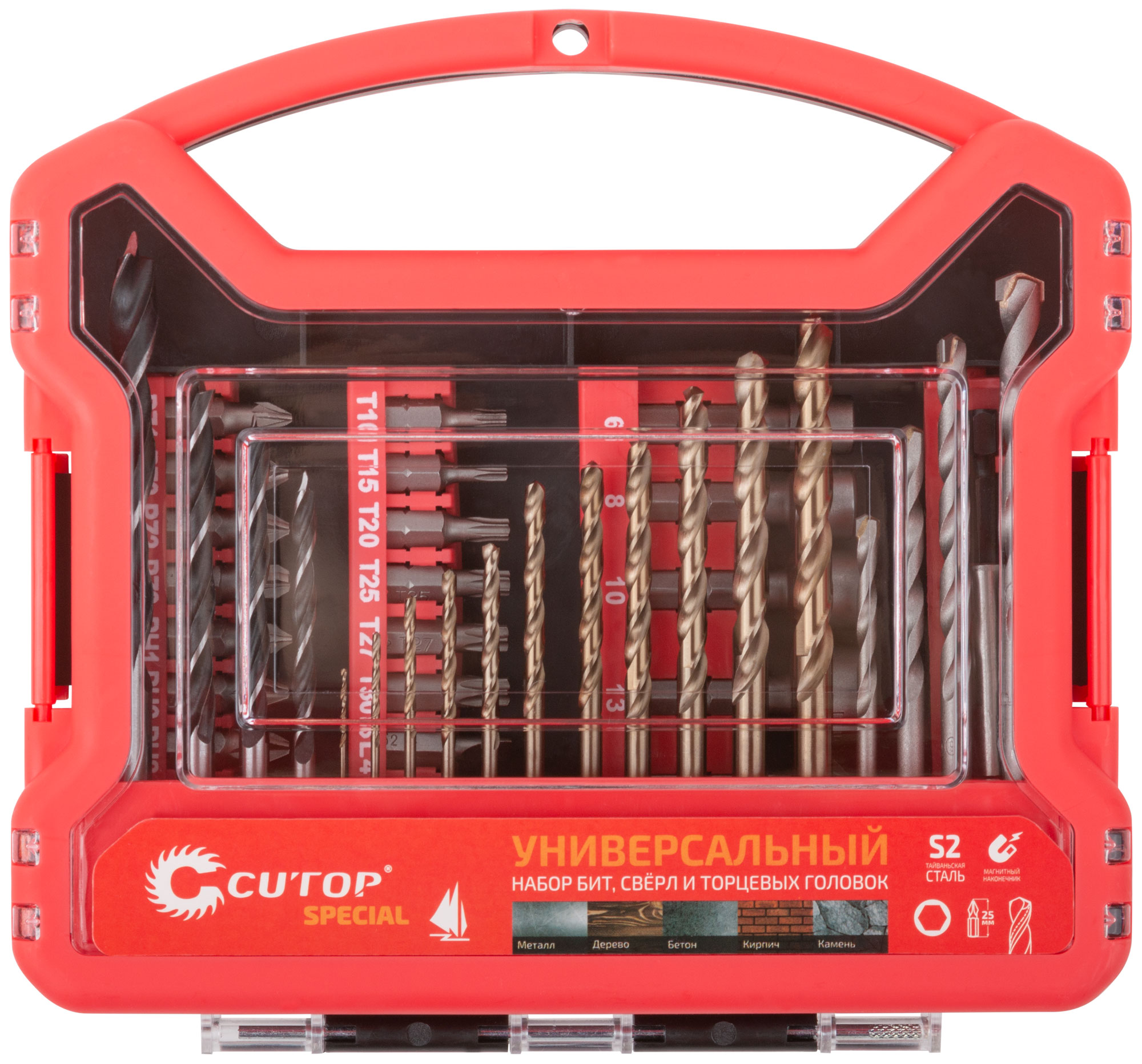 Этот универсальный набор от Cutop включает 41 предмет и станет незаменимым помощником на строительной площадке или в мастерской. Он идеально подходит для сверления и крепежа в углеродистых и легированных сталях, чугунах, цветных металлах и пластике, а также для работы с деревом и бетоном.