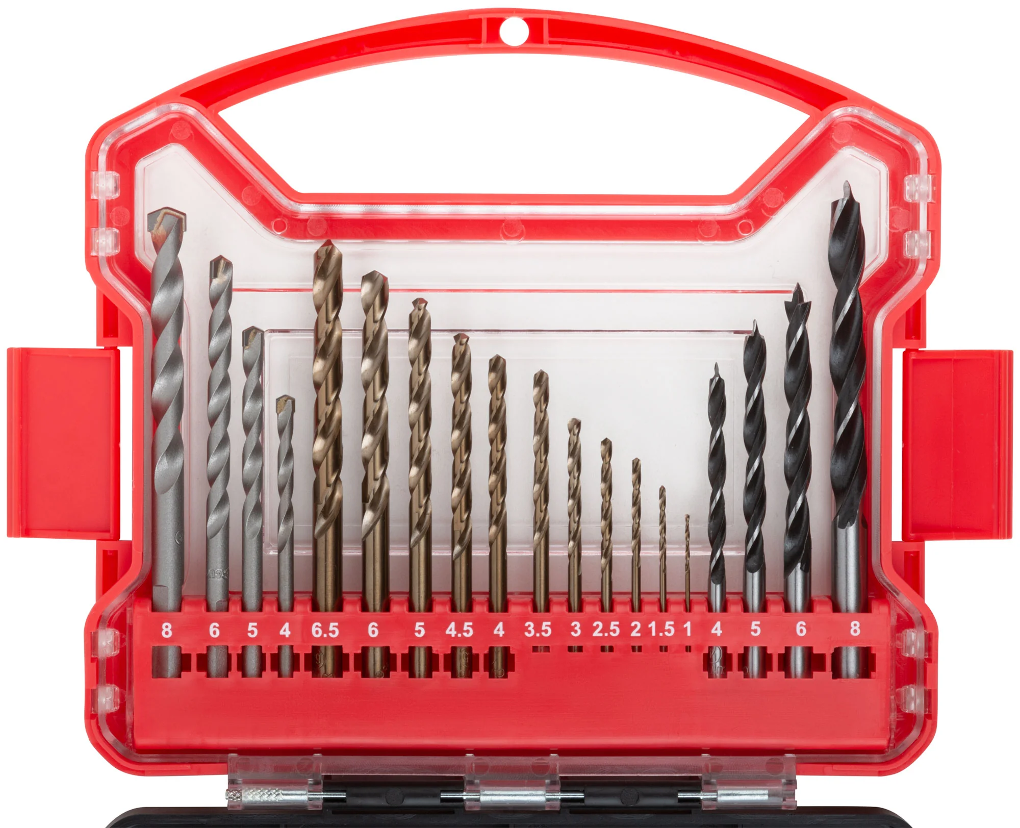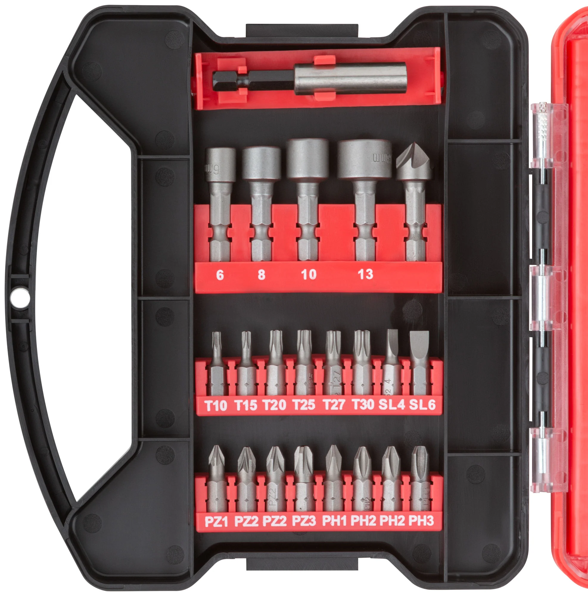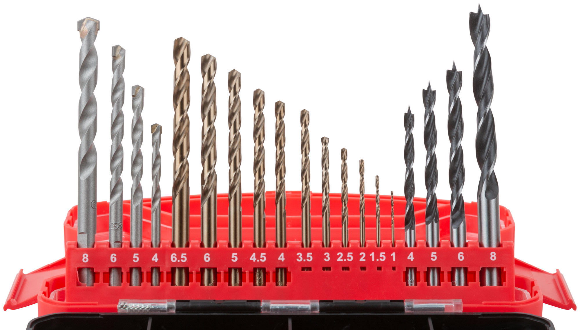 Биты в наборе изготовлены из тайваньской стали марки S2, которая славится своей прочностью и долговечностью. Сверла выполнены из высококачественной стали типа HSS, обеспечивающей отличные режущие свойства и долгий срок службы. Все предметы набора компактно упакованы в кейс размером 170x180x35 мм, что позволяет легко хранить и транспортировать инструмент.