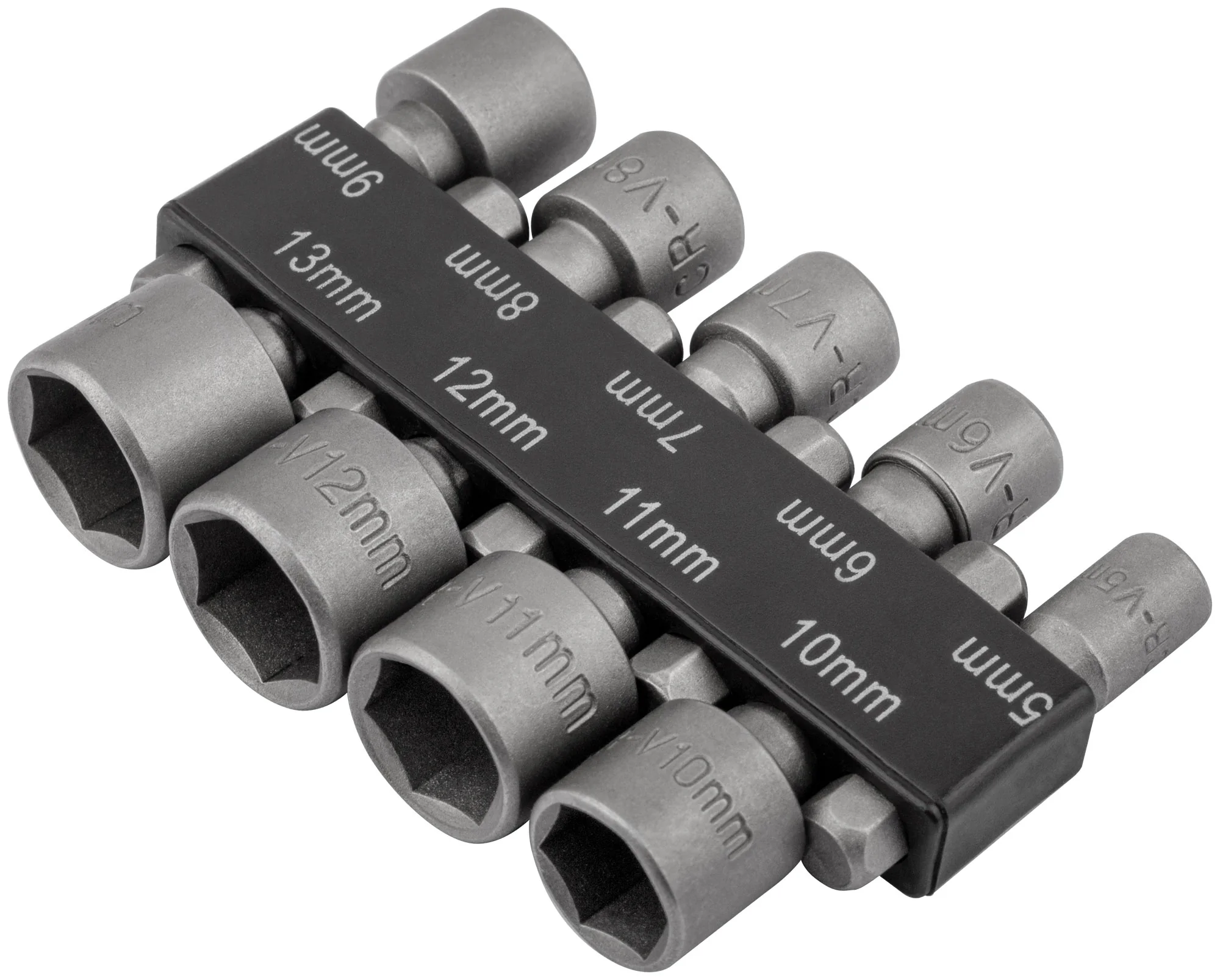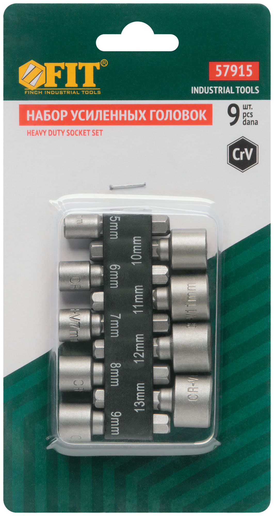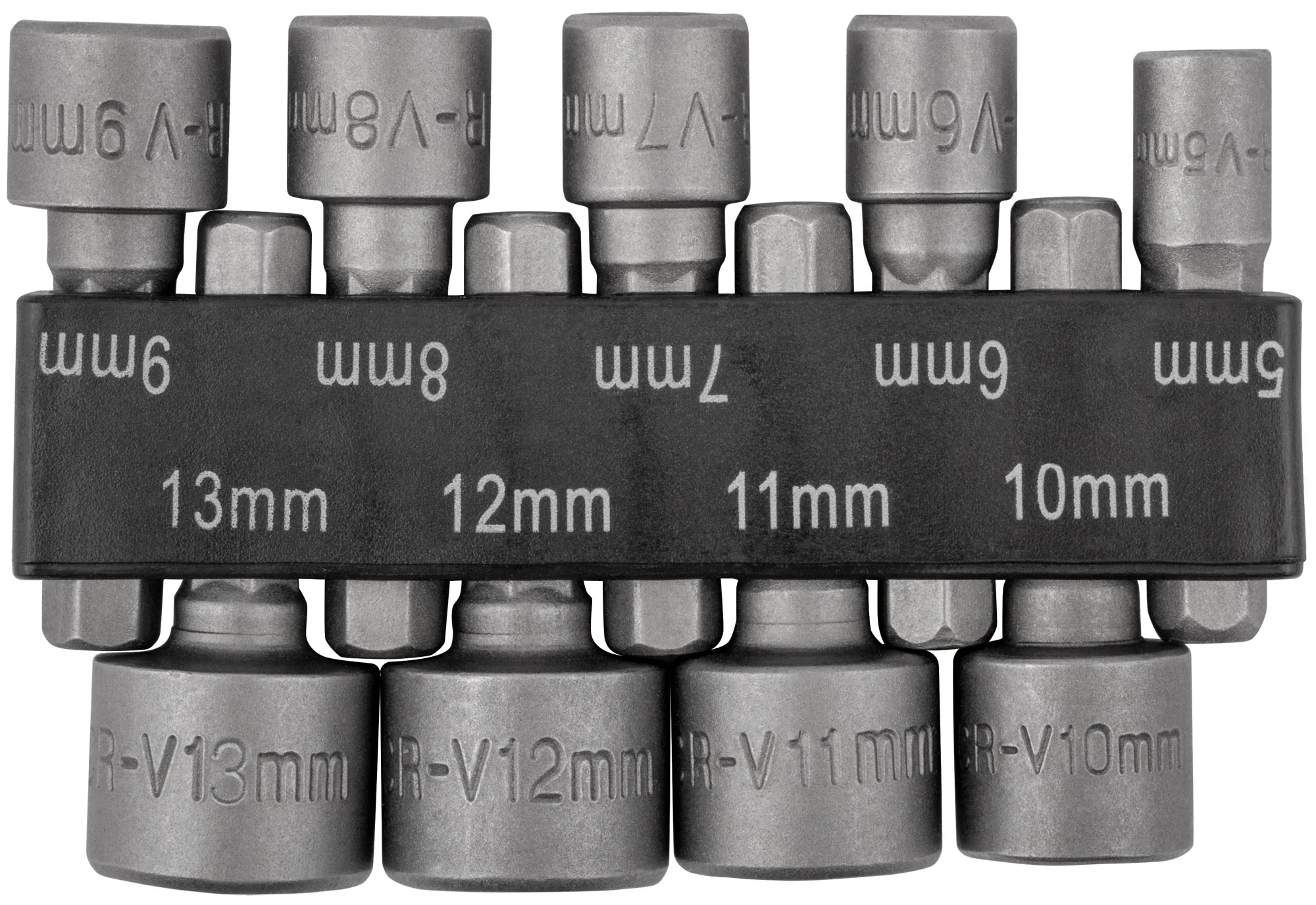 В набор входят 9 головок размером от 5 до 13 мм, выполненных из закаленной хром-ванадиевой стали. Упакован в удобный блистер, что обеспечивает легкость в хранении и транспортировке.