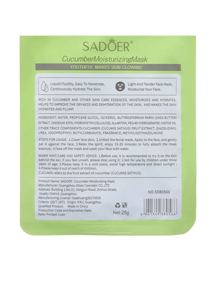 - Тканевая маска для лица с экстрактом огурца, увлажняющая - 1 шт