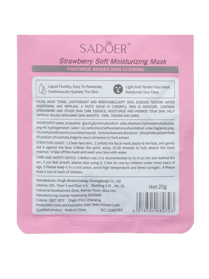 - Тканевая маска для лица с экстрактом клубники, увлажняющая - 1 шт