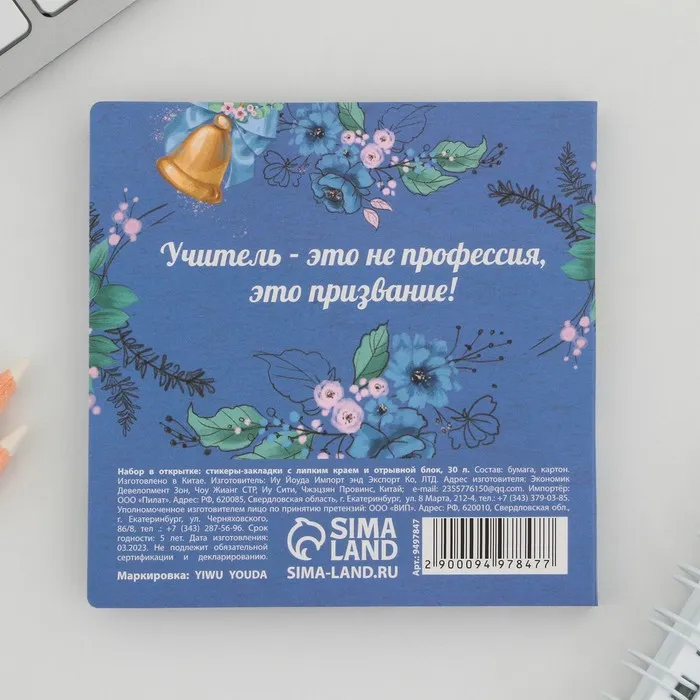Набор в открытке «Учителю», стикеры 4×20 листов, отрывной блок 30 листов — Характеристики