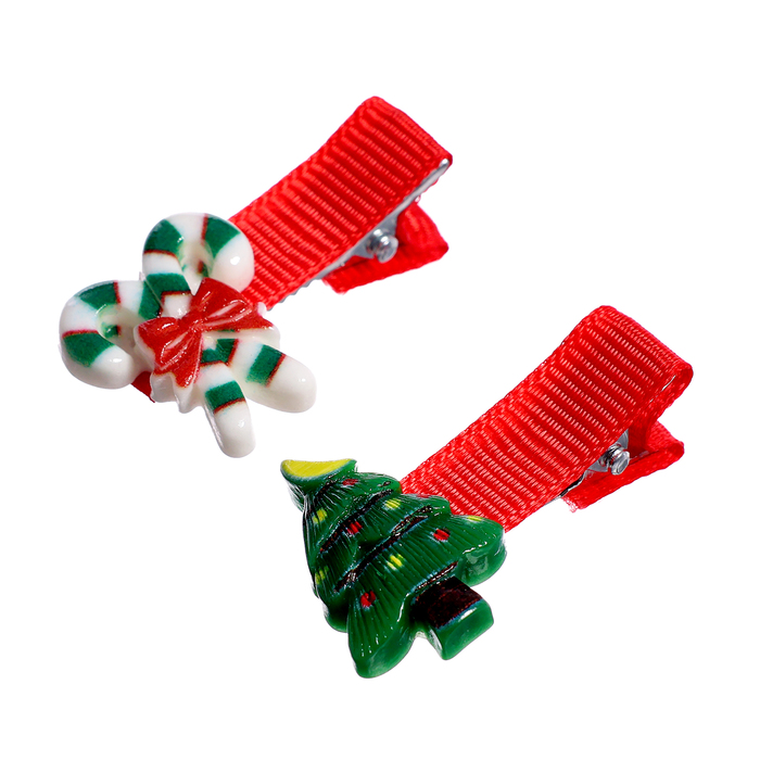 - 2 стильные заколки с новогодней тематикой, украшенные ёлочками и леденцами.