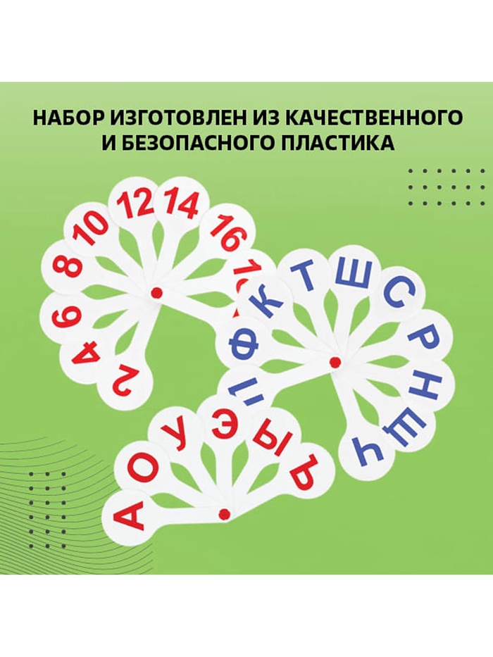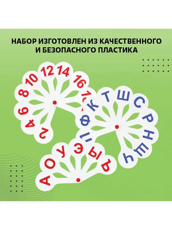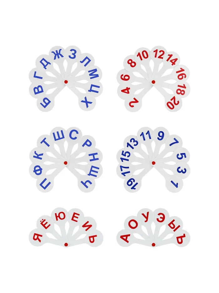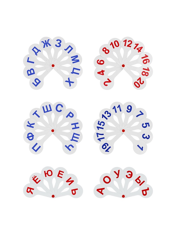 Набор содержит 3 веера с гласными и согласными буквами русского алфавита, а также цифрами. Символы нанесены с двух сторон. Крупный размер и шрифт, качественная печать, устойчив к истиранию. Изготовлен из сертифицированного плотного полипропилена. Размер в индивидуальной упаковке- 240 х 190 х 15 мм. Поставляется в пакете с европодвесом.