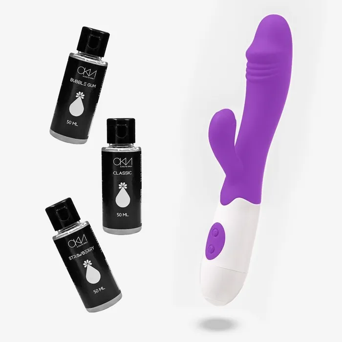 В состав набора входит 4 предмета: вибратор-кролик, лубрикант классический, лубрикант со вкусом бабл гам, лубрикант со вкусом клубники .