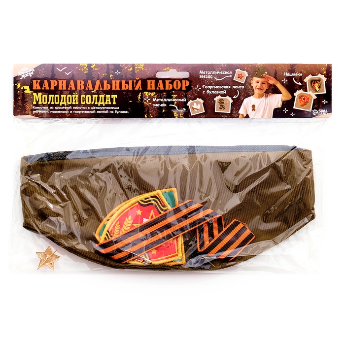 Набор военного на 9 мая «Молодой солдат»: пилотка, значок, георгиевская лента, нашивка, р-р 54-56 — Характеристики
