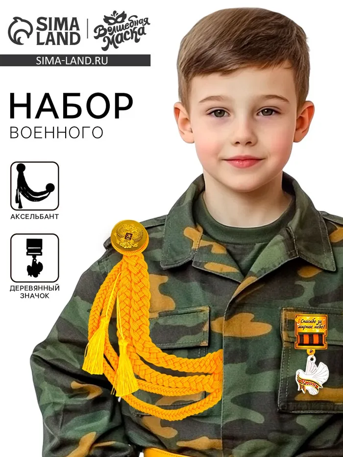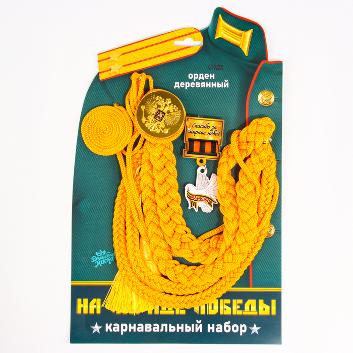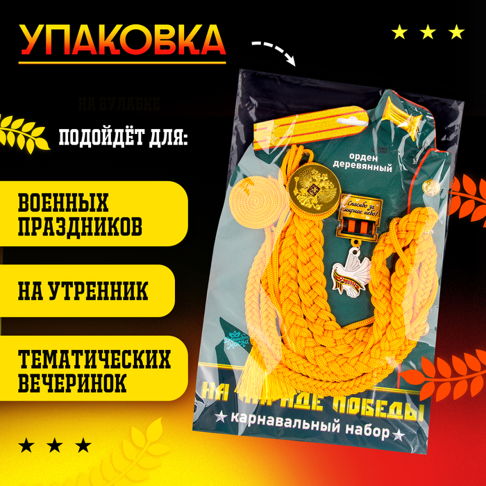 Карнавальный набор «На парад победы» — незаменимые аксессуары для создания образа солдата на параде. Аксельбант и значок помогут вам погрузиться в атмосферу праздника и почувствовать себя настоящим защитником Родины.