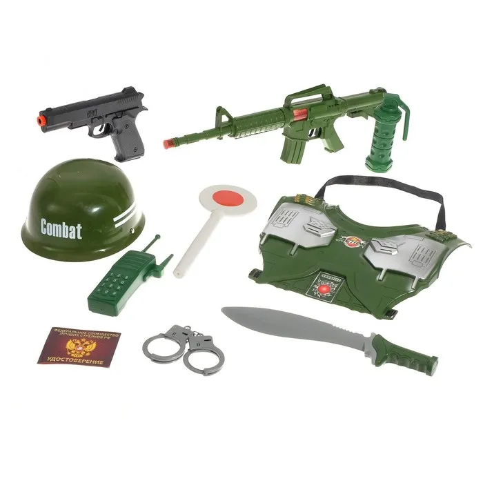 - Полный комплект для миссий: а набор входят все необходимые предметы для полного погружения в игру: автомат-трещотка, пистолет, нож, каска, бронежилет, наручники, рация, граната и жезл. Каждый элемент добавляет реализма и помогает разыгрывать захватывающие сценарии.