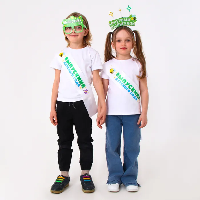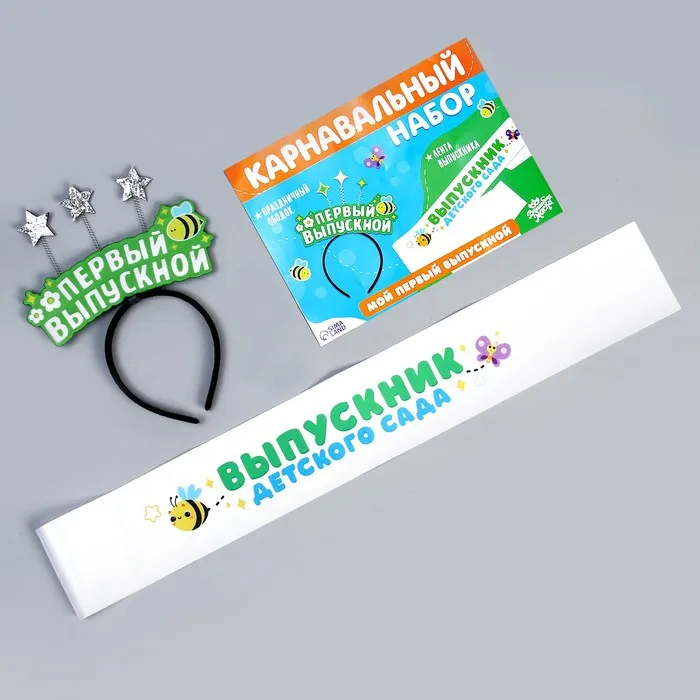 Карнавальный набор «Мой первый выпускной» — эффектное дополнение к выпускному костюму для малышей. Лента прекрасно подчеркнёт образ, а ободок со звёздочками добавит игривости.