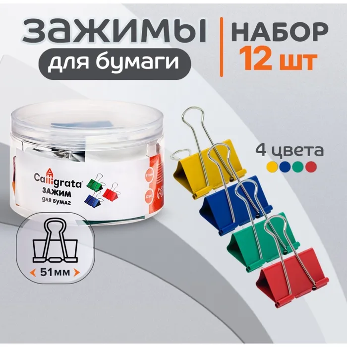Набор зажимов для бумаг цветных 51 мм, 12 штук, 4 цвета, в пластиковой тубе — Характеристики