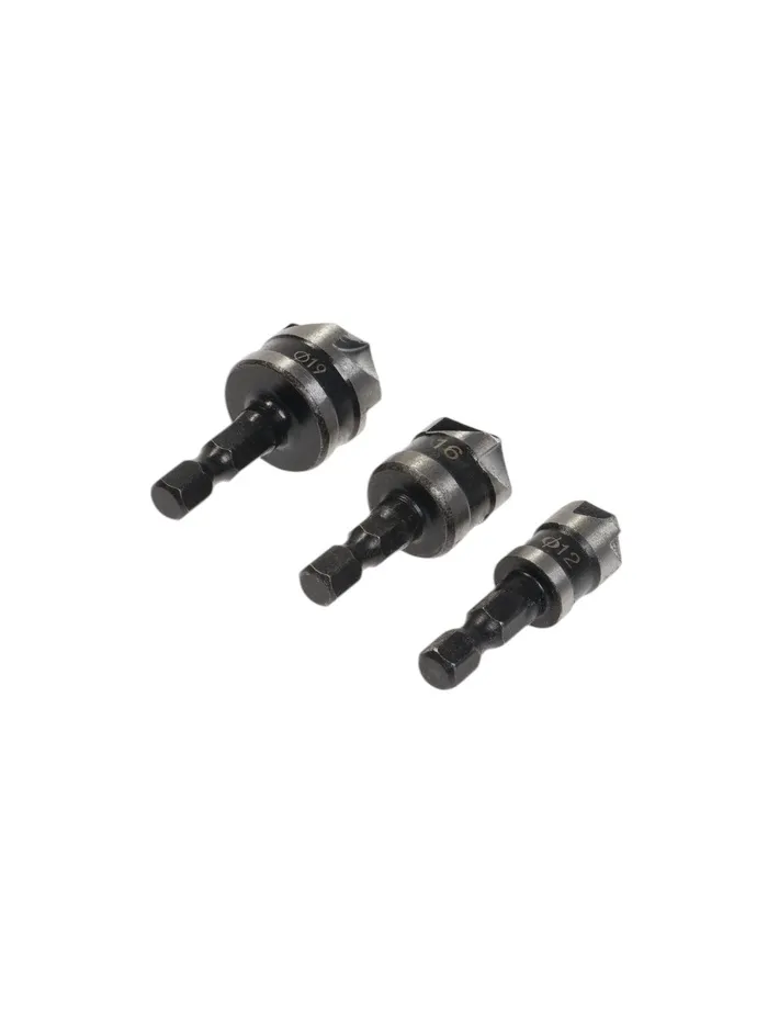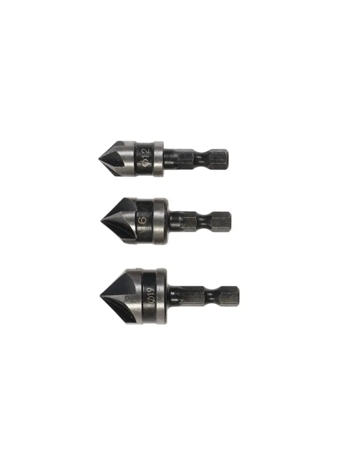 Точность и чистота в каждой обработке — Набор зенкеров по дереву, пластику и цветным металлам — профессиональный инструмент для зачистки, расширения и финальной обработки отверстий. Три размера — 12, 16 и 19 мм — охватывают основные задачи на стройплощадке, в мастерской или дома.