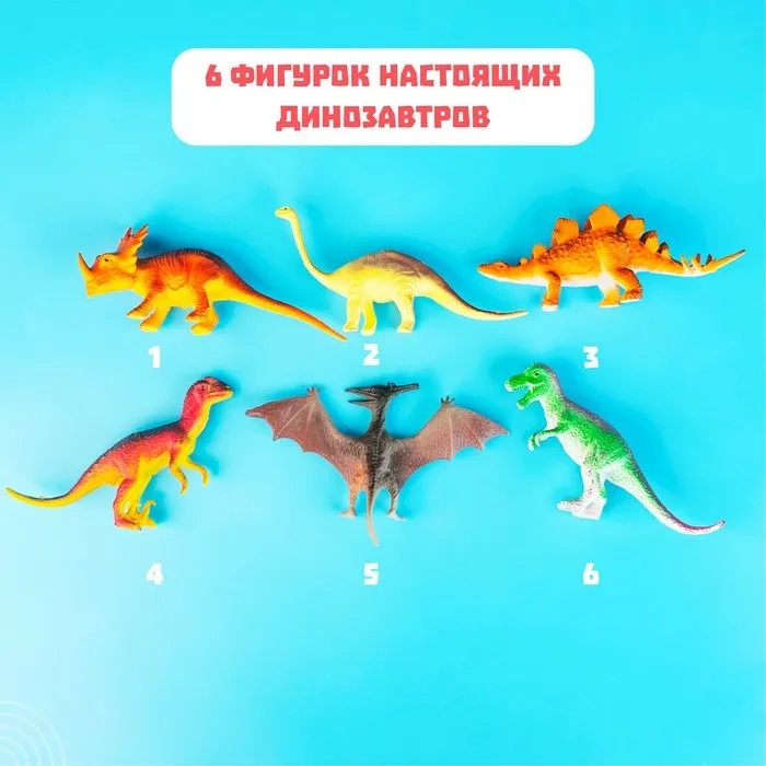 - 6 фигурок динозавров разных видов: тираннозавр, велоцираптор, птеродактиль, трицератопс, стегозавр, диплодок.