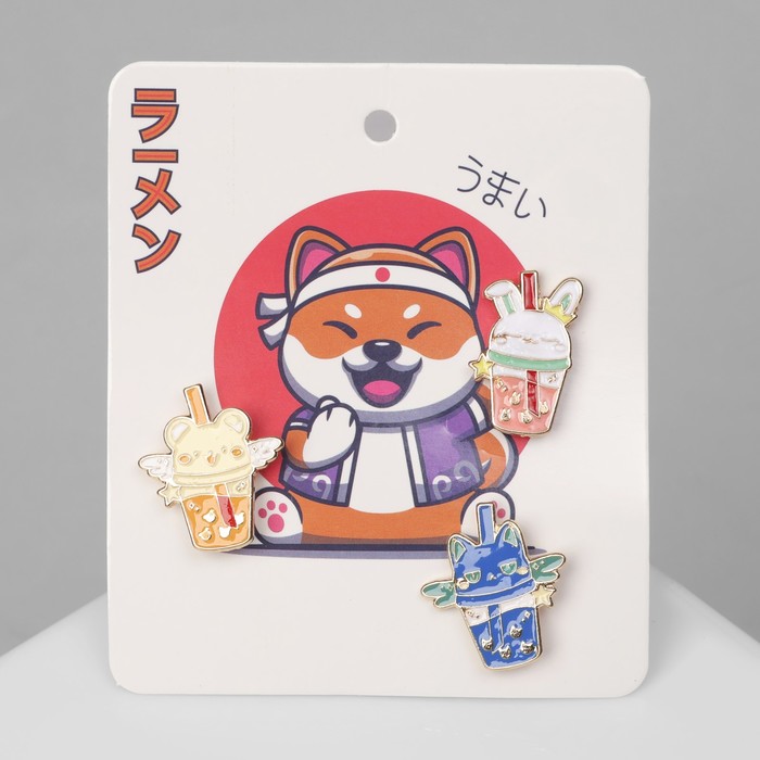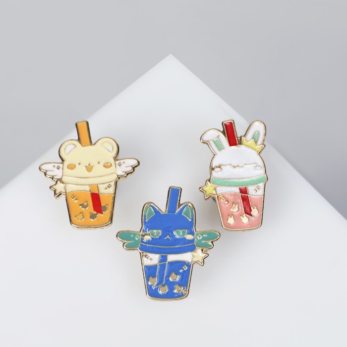 Набор значков (3 шт.) «Стаканчики» зверята, цветные в золоте — Характеристики