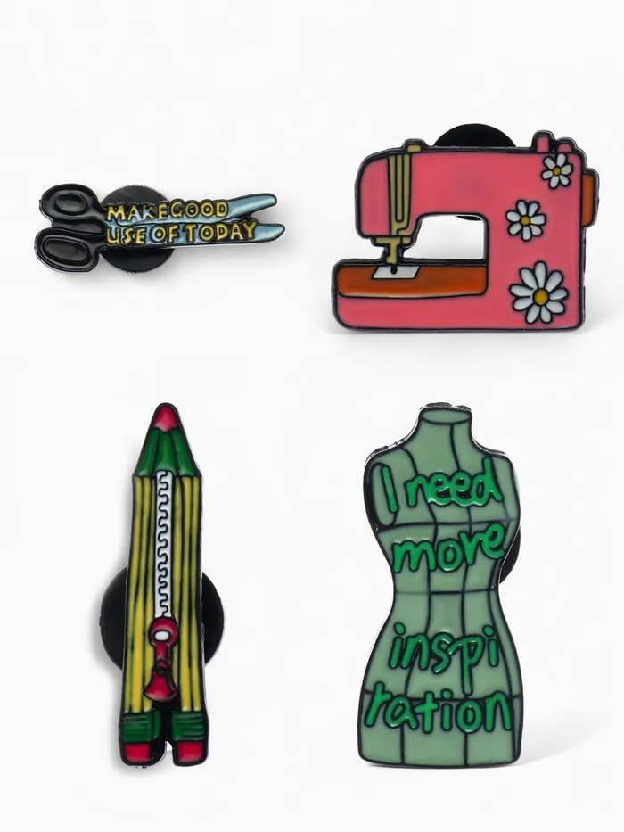 Набор из четырёх значков, посвящённых искусству шитья, станет ярким акцентом для тех, кто ценит профессионализм и творческий подход в работе с тканью. Каждый значок размером 3 см выполнен из прочного металла с чёрной фурнитурой и украшен цветными эмалевыми вставками, которые подчёркивают детали тематических изображений — от катушки ниток и ножниц до швейной машинки и иглы.