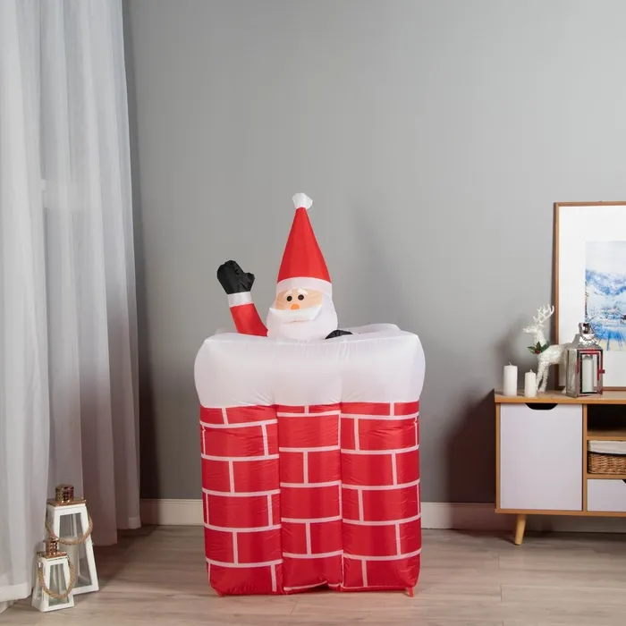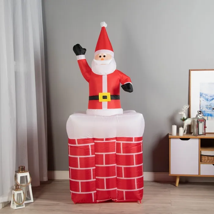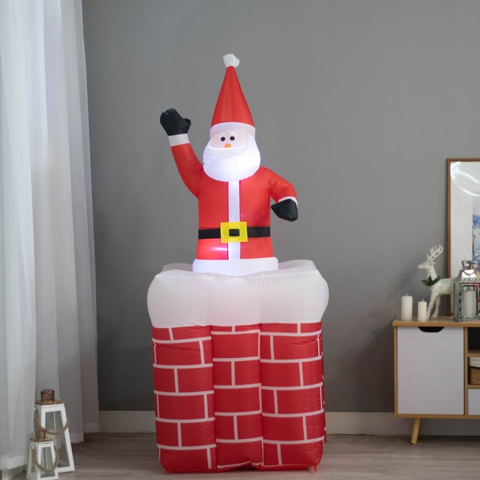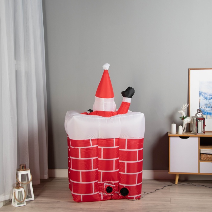 Надувной Дед Мороз, вылезающий из печной трубы - оптимальный вариант для оформления витрины магазина или детского уголка в кафе. Понравится всем, кто любит новый взгляд на старые вещи. Новогодние игрушки, елочные украшения довольно традиционны и повторяются из года в год. Надувные новогодние украшения ярко выделят именно вашу витрину. Они выглядят задорно и в то же время очень душевно, привлекает внимание их большой размер, яркие цвета, объемность.