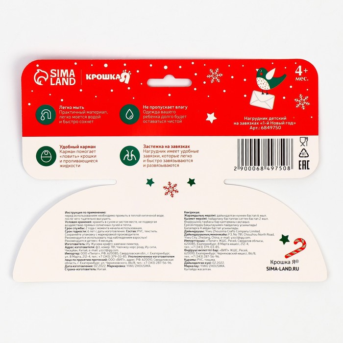 Товар изготовлен из материалов, не содержащего токсичных веществ. После использования мойте тёплой мыльной водой. Нагрудник рекомендован для детей старше 4 месяцев.