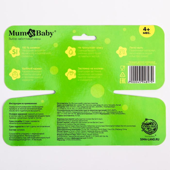 Товар изготовлен из силикона, не содержащего токсичных веществ. После использования мойте тёплой мыльной водой. Нагрудник рекомендован для детей старше 4 месяцев.