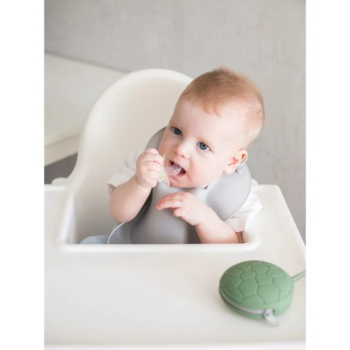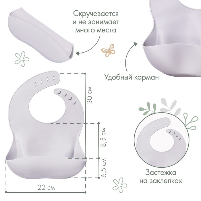 Силиконовый нагрудник не промокает, поэтому одежда малыша не испачкается в процессе кормления. У слюнявчика есть кармашек, куда попадают все крошки: чистым останется не только сам ребёнок, но и место, где он кушает.