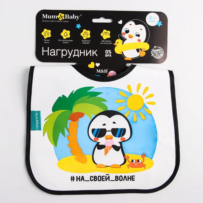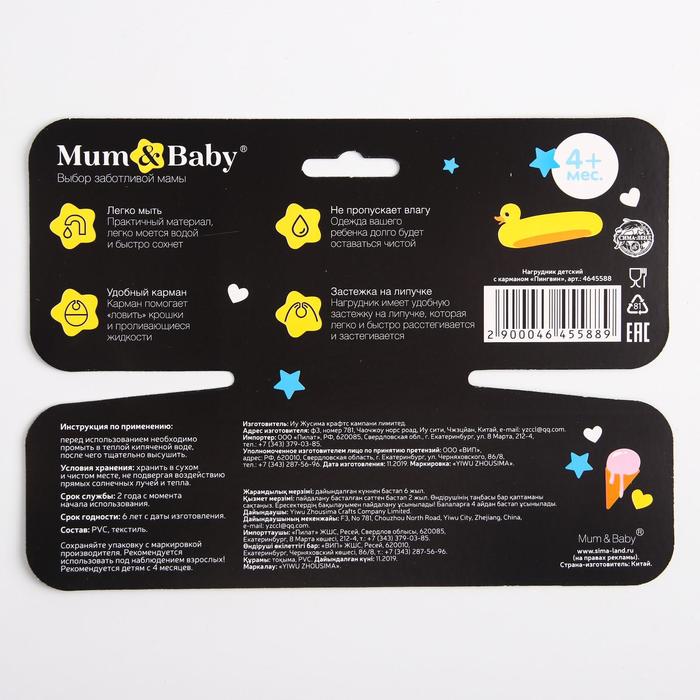 Товар изготовлен из материалов, не содержащего токсичных веществ. После использования мойте тёплой мыльной водой. Нагрудник рекомендован для детей старше 4 месяцев.