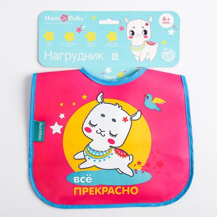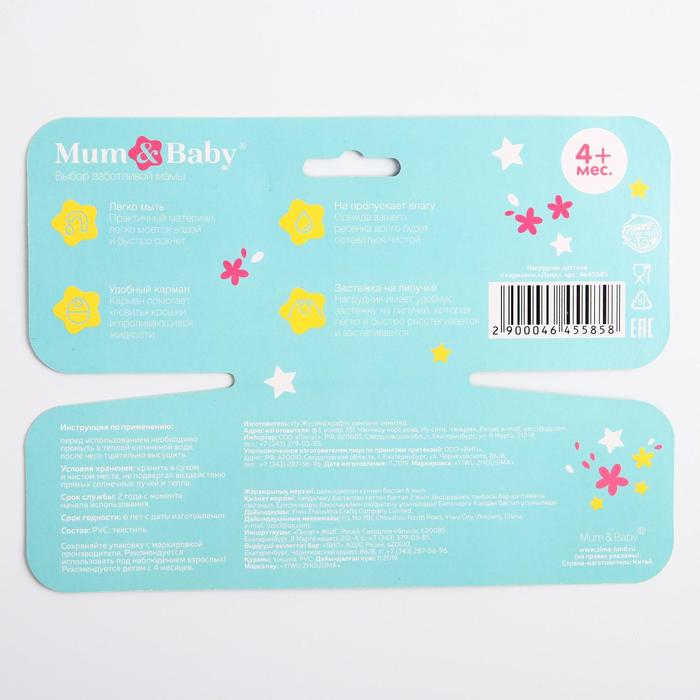 Товар изготовлен из материалов, не содержащего токсичных веществ. После использования мойте тёплой мыльной водой. Нагрудник рекомендован для детей старше 4 месяцев.