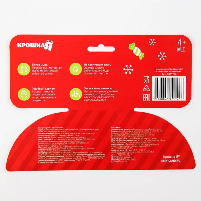 Товар изготовлен из материалов, не содержащего токсичных веществ. После использования мойте тёплой мыльной водой. Нагрудник рекомендован для детей старше 4 месяцев.