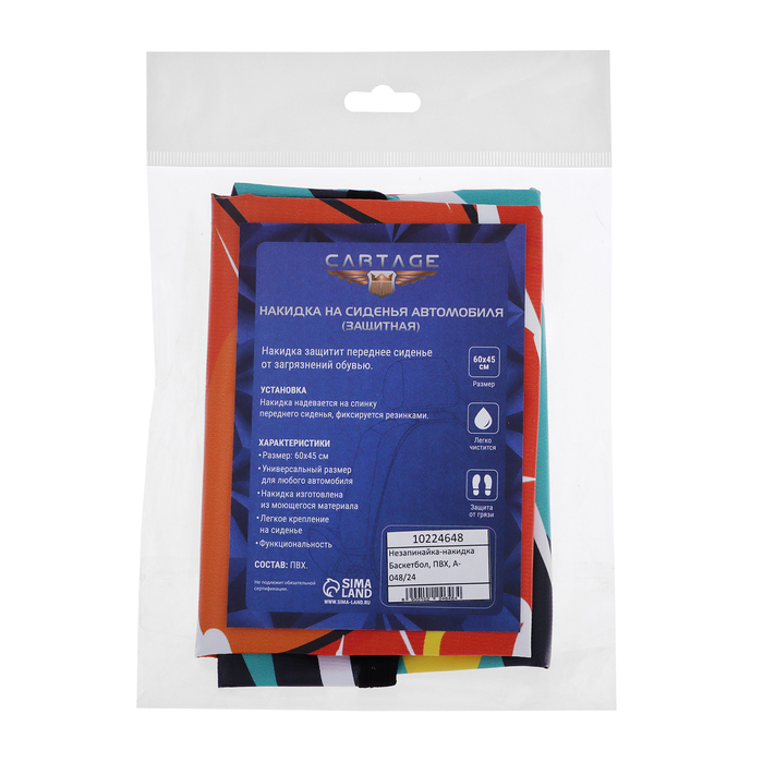 Незапинайка-накидка защитная “Баскетбол” от Cartage изготовлена из ПВХ и предназначена для защиты спинки переднего сиденья и двери автомобиля от грязи, пыли и механических повреждений. Она легко крепится с помощью липучек и не мешает обзору водителя. Накидка имеет размеры 60х45 см и представлена в ярком цвете, который добавит изюминку в интерьер вашего автомобиля. С помощью европодвеса вы сможете удобно и аккуратно хранить накидку в багажнике автомобиля.