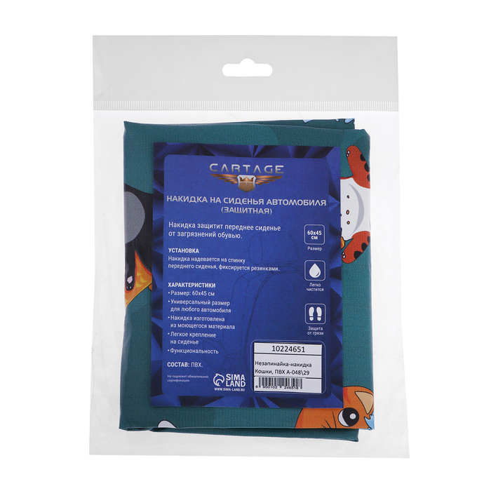 Незапинайка-накидка защитная “Кошки” от Cartage изготовлена из ПВХ и предназначена для защиты спинки переднего сиденья и двери автомобиля от грязи, пыли и механических повреждений. Она легко крепится с помощью липучек и не мешает обзору водителя. Накидка имеет размеры 60х45 см и представлена в ярком цвете, который добавит изюминку в интерьер вашего автомобиля. С помощью европодвеса вы сможете удобно и аккуратно хранить накидку в багажнике автомобиля.