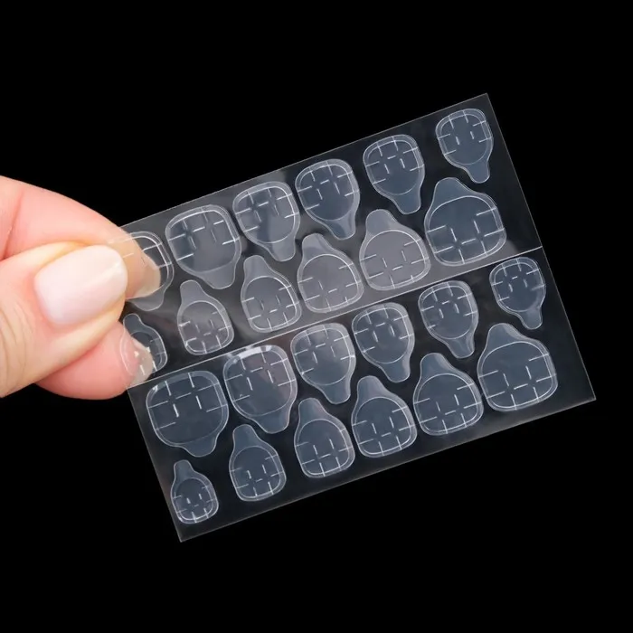 В наборе с накладными ногтями идут клеевые пластины. За счёт этого уменьшается вероятность механического травмирования природного ногтя. Клеевые пластины безопасны в применении и не вредят натуральным ногтям, в отличие от клея. Клей содержит составе высокую токсичность, что может сказаться на вашем организме.