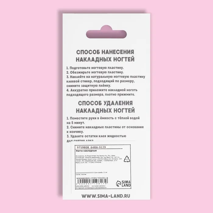 Максимальный срок носки накладных ногтей – 14 дней. Не рекомендуем перенашивать. При бережном ношении могут использоваться несколько раз.