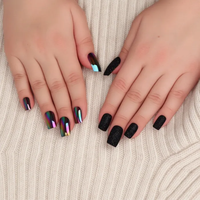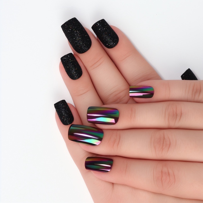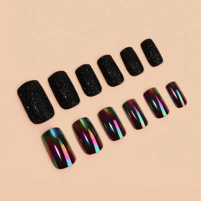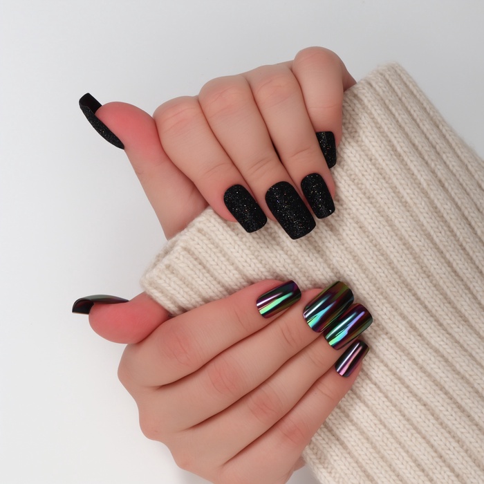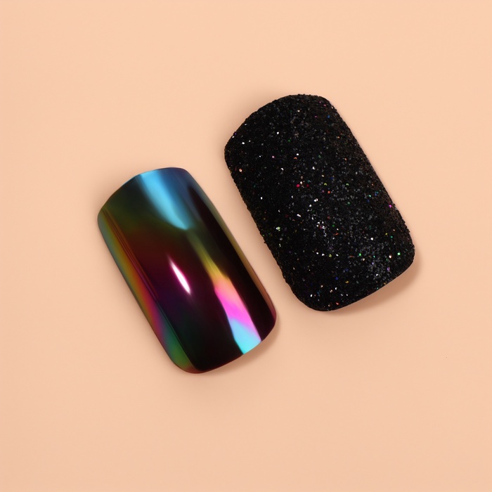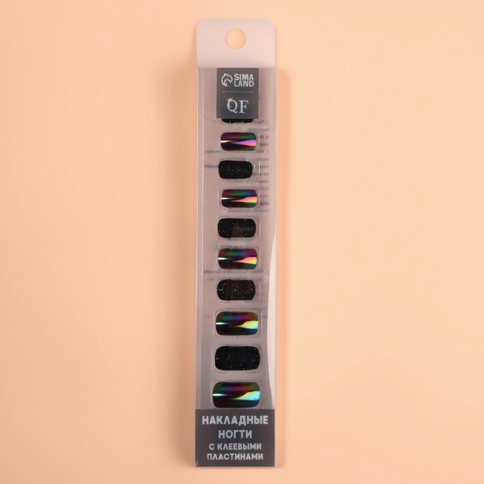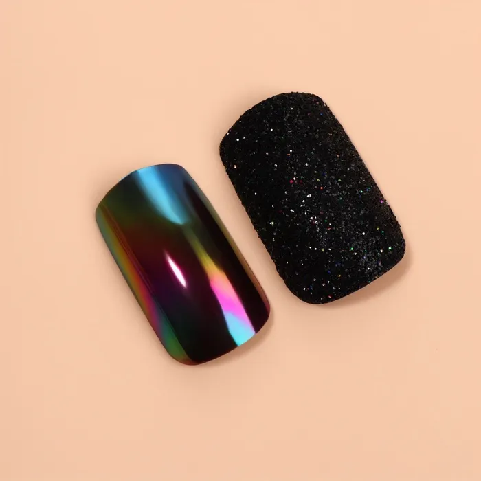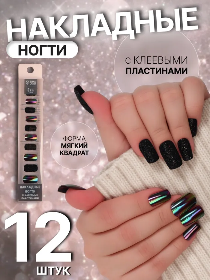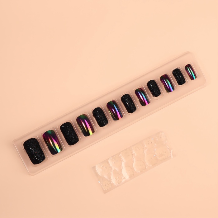Накладные ногти «Ночь», 12 шт, с блёстками и голографией, с клеевыми пластинами, форма мягкий квадрат, чёрные — Характеристики