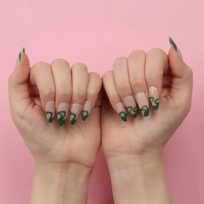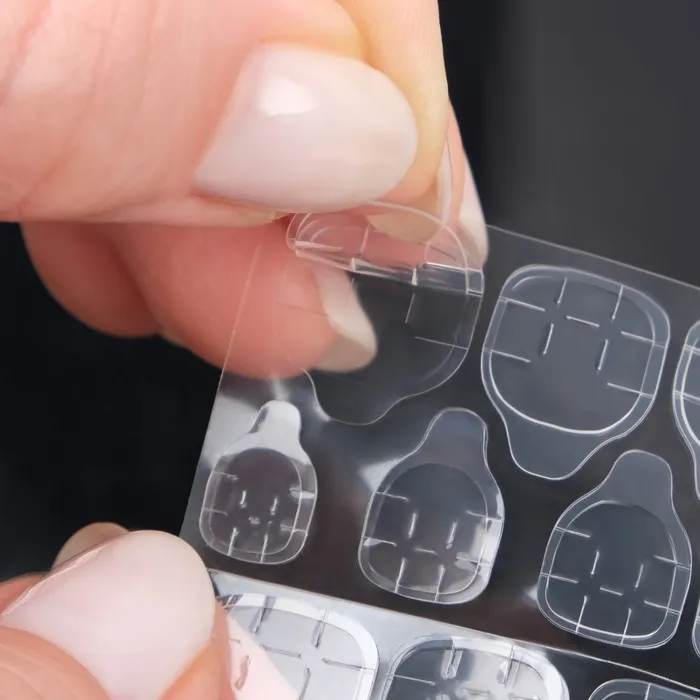 В наборе с накладными ногтями идут клеевые пластины. За счёт этого уменьшается вероятность механического травмирования природного ногтя. Клеевые пластины безопасны в применении и не вредят натуральным ногтям, в отличие от клея. Клей содержит составе высокую токсичность, что может сказаться на вашем организме.
