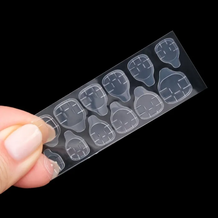 - Безопасность для ногтей: клеевые пластины не наносят вреда, а процедура снятия занимает считанные минуты с использованием обычной жидкости для снятия лака или горячей воды.