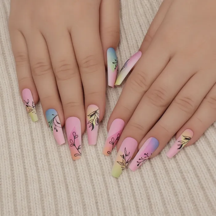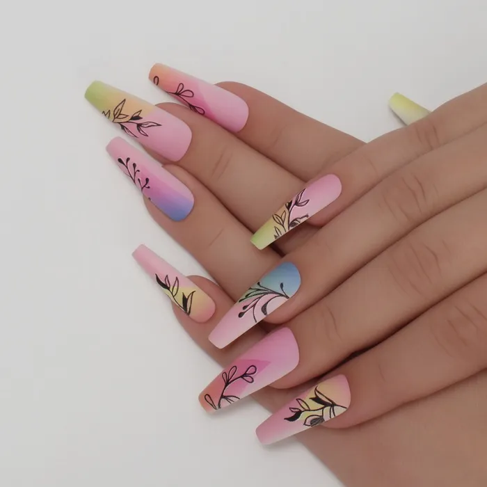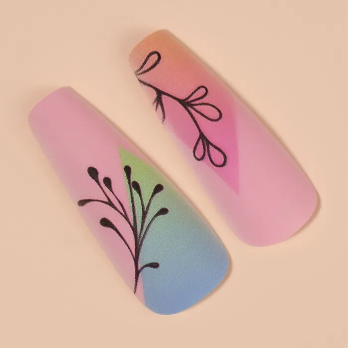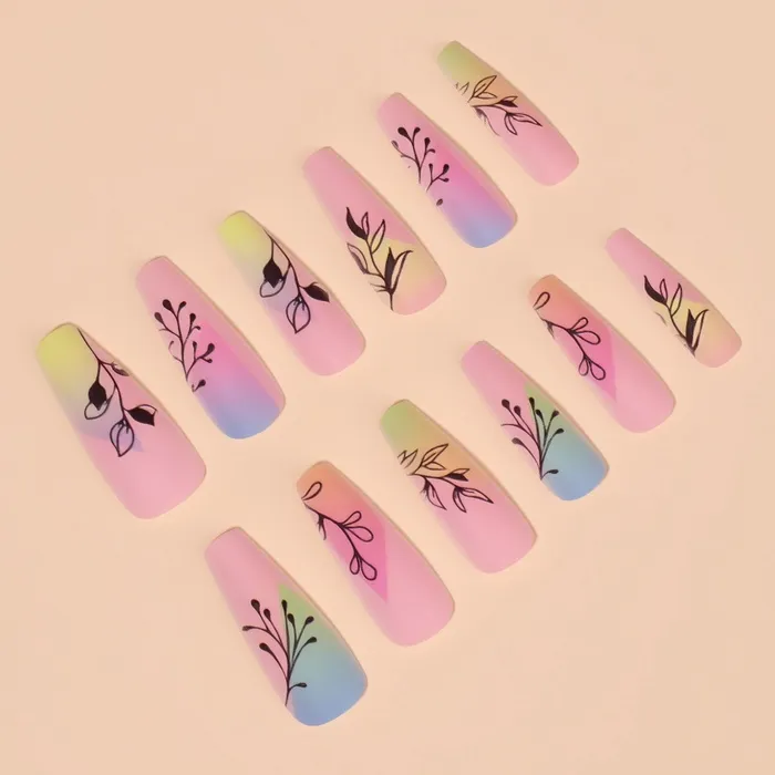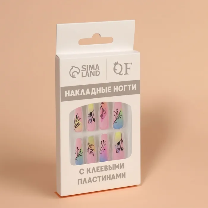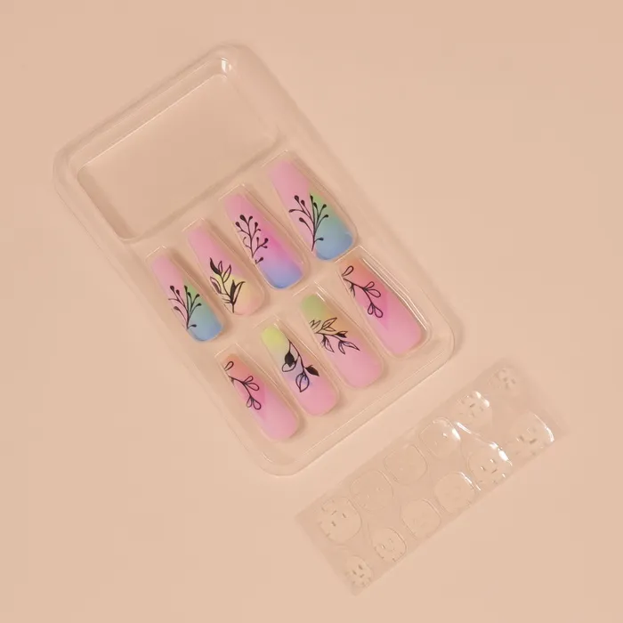 Накладные ногти «Веточки», 12 шт., с клеевыми пластинами, форма балерина, разноцветные — Характеристики