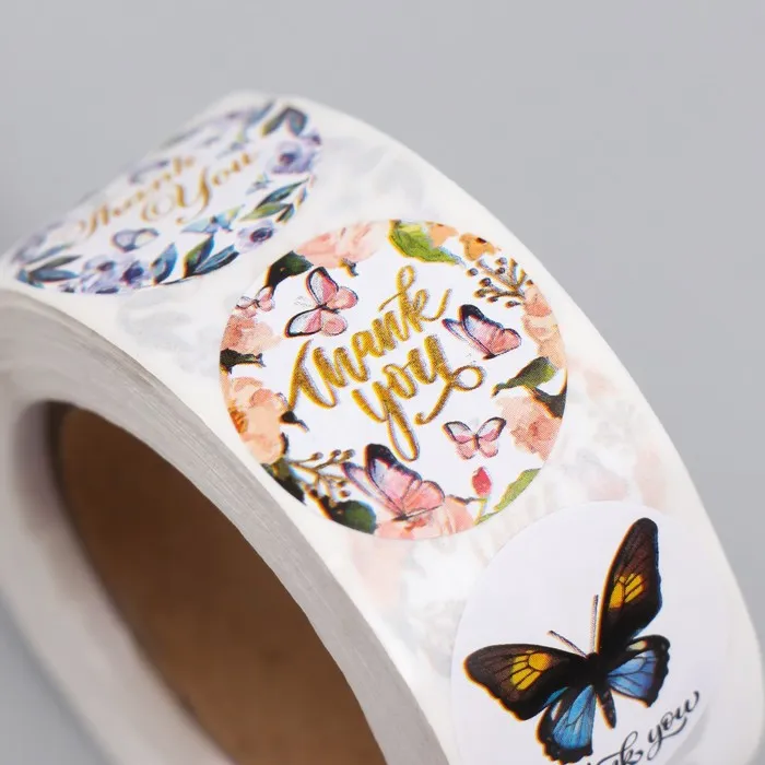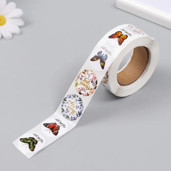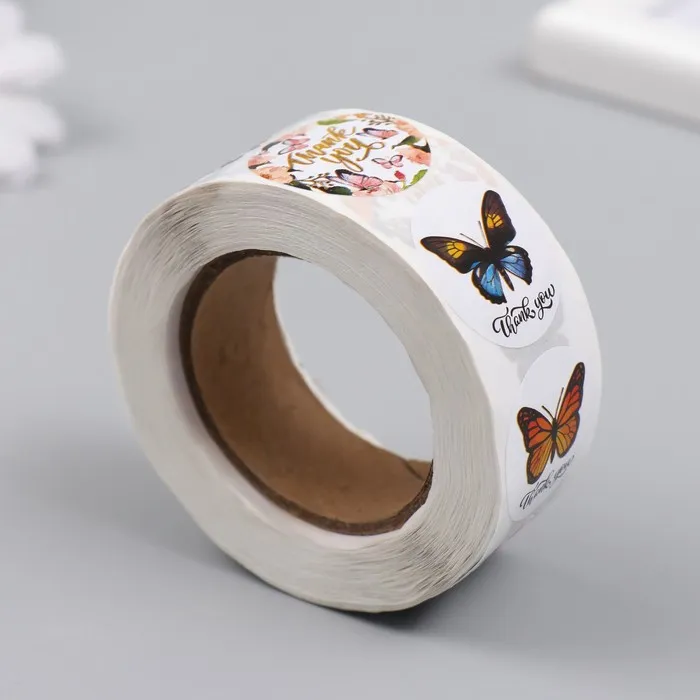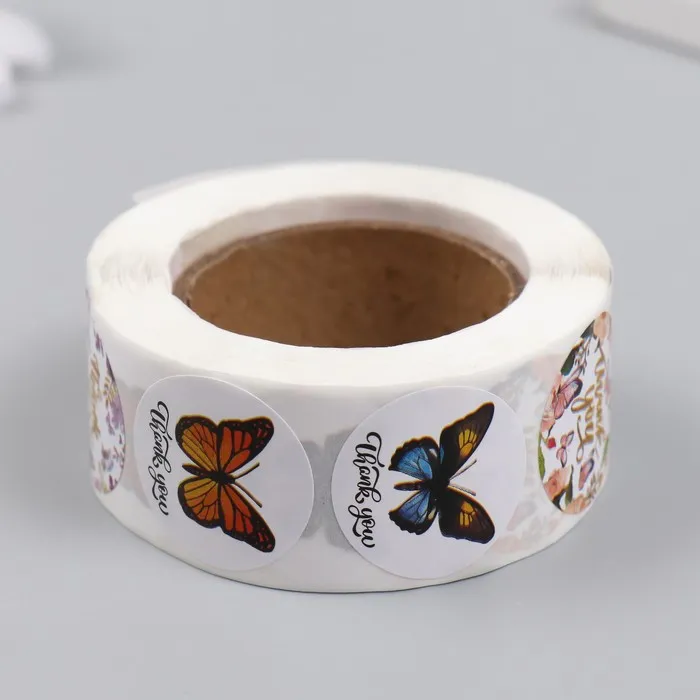 Наклейка бумага "Бабочки. Спасибо" d=2,5 см 500 шт в рулоне — Характеристики