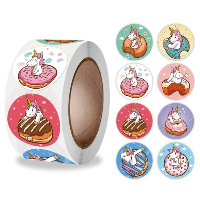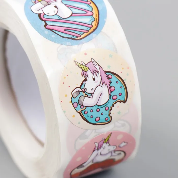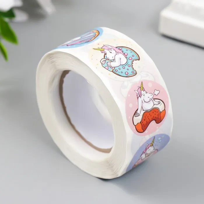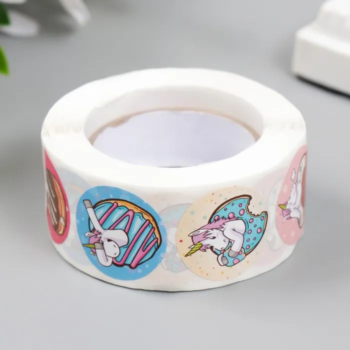 Наклейка бумага «Единорожки и пончики», d=2.5 см, 500 шт. в рулоне, 3×6.5×6.5 см — Характеристики