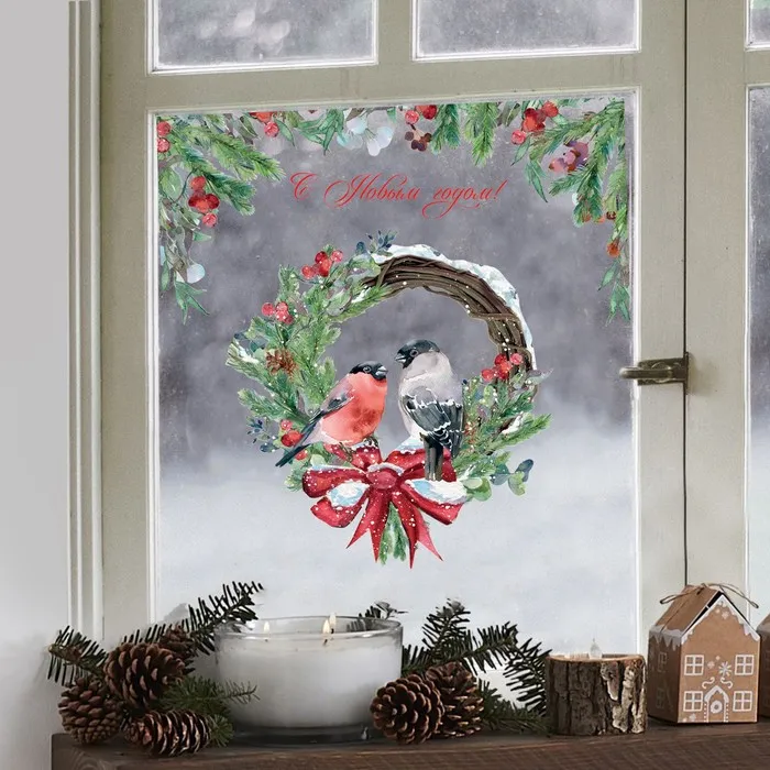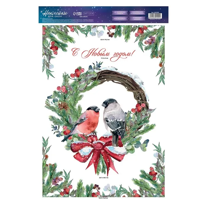 Наклейка для окон «С Новым годом», снегири, многоразовая, 33 х 50 см — Характеристики
