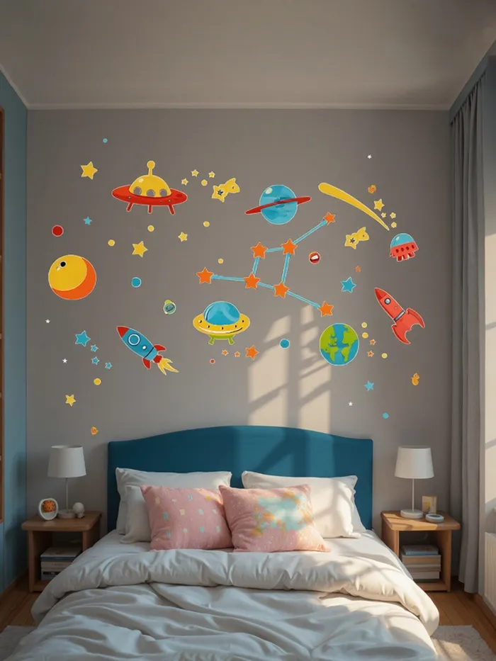 - Приложите наклейку к стене, наметьте место, куда вы хотите её приклеить. При необходимости закрепите её малярным скотчем, чтобы посмотреть издалека, как она будет выглядеть. Если устраивает — начинайте клеить.