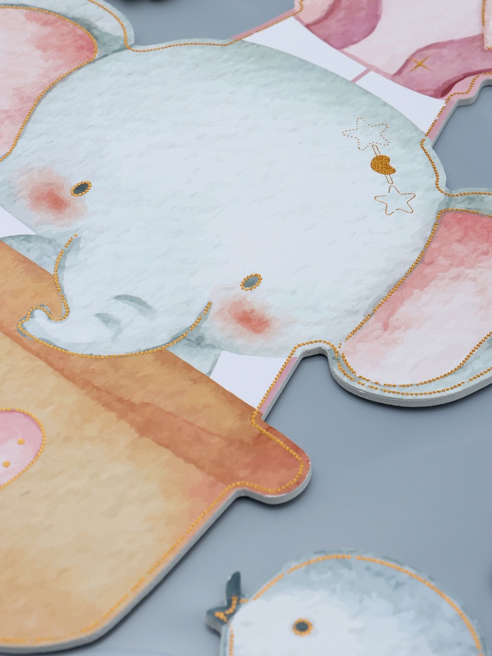 Изящный интерьерный элемент с изображением очаровательного слонёнка создаст в детской комнате атмосферу уюта и заботы. Размер листа оптимально подходит для оформления стен, дверей или мебели, добавляя интерьеру мягкие и тёплые акценты, которые особенно важны в период празднования рождения ребёнка.