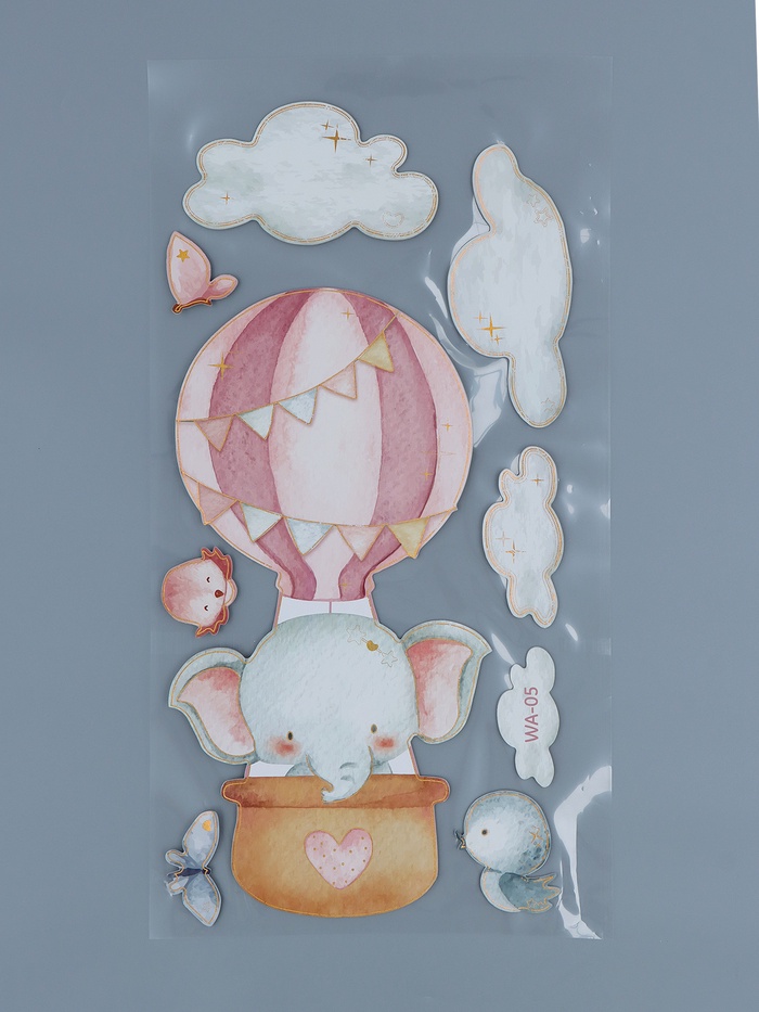 Изящный интерьерный элемент с изображением очаровательного слонёнка создаст в детской комнате атмосферу уюта и заботы. Размер листа оптимально подходит для оформления стен, дверей или мебели, добавляя интерьеру мягкие и тёплые акценты, которые особенно важны в период празднования рождения ребёнка.
