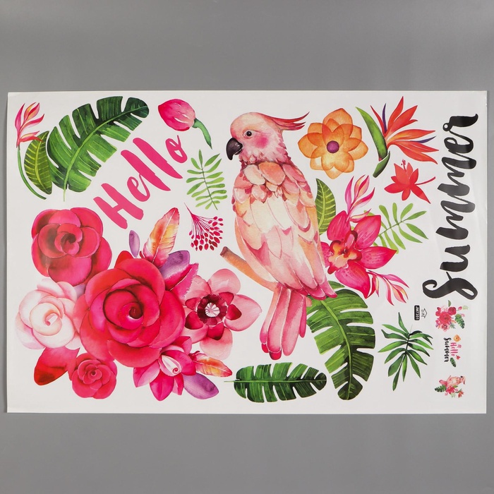 Наклейка интерьерная цветная «Розовый какаду и цветы», 60×90 см