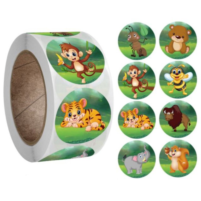 Наклейка бумага "Жители джунглей" d=2,5 см 500 шт в рулоне 3х6,5х6,5 см