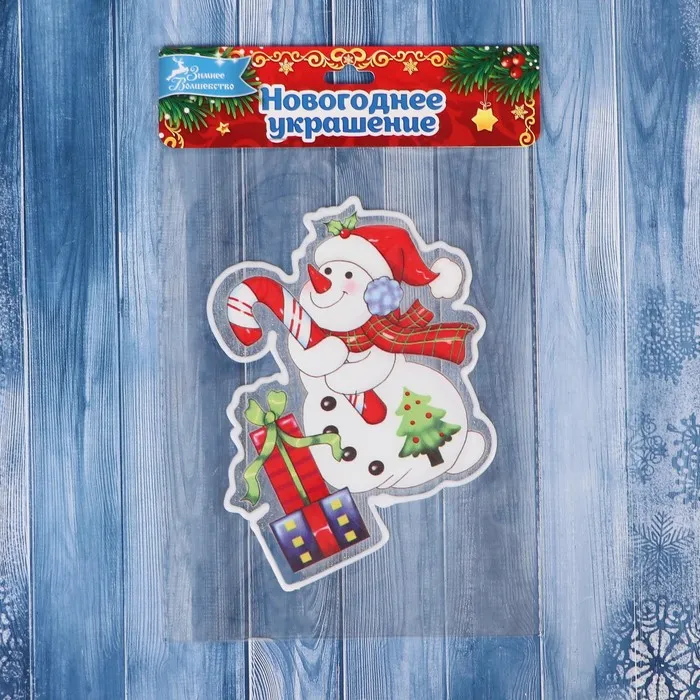 Наклейка на стекло «Снеговик с леденцом и подарками», 9×14 см — Характеристики