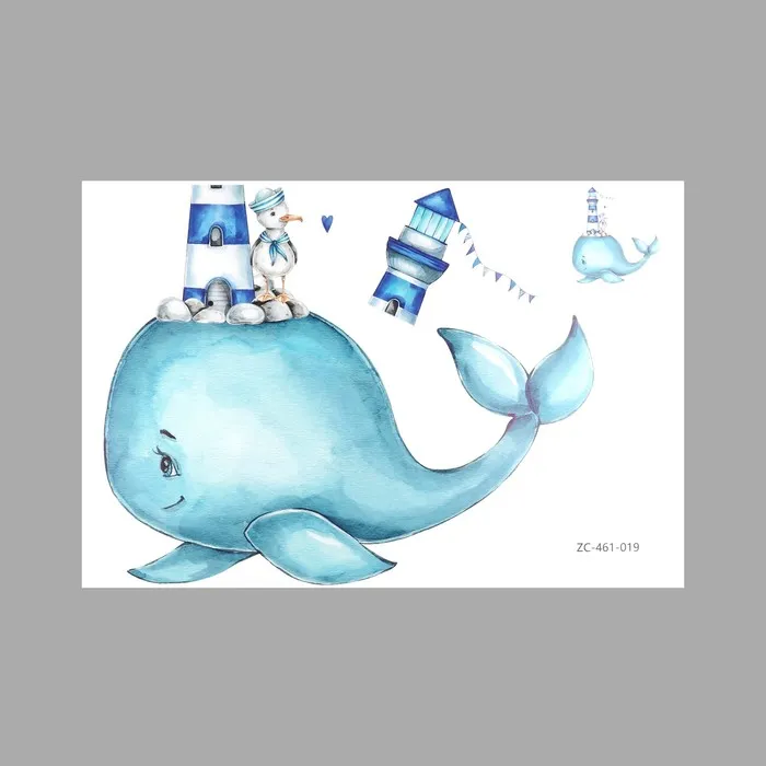 Наклейка пластик интерьерная цветная "Кит с маяком и чайкой" 40х60 см