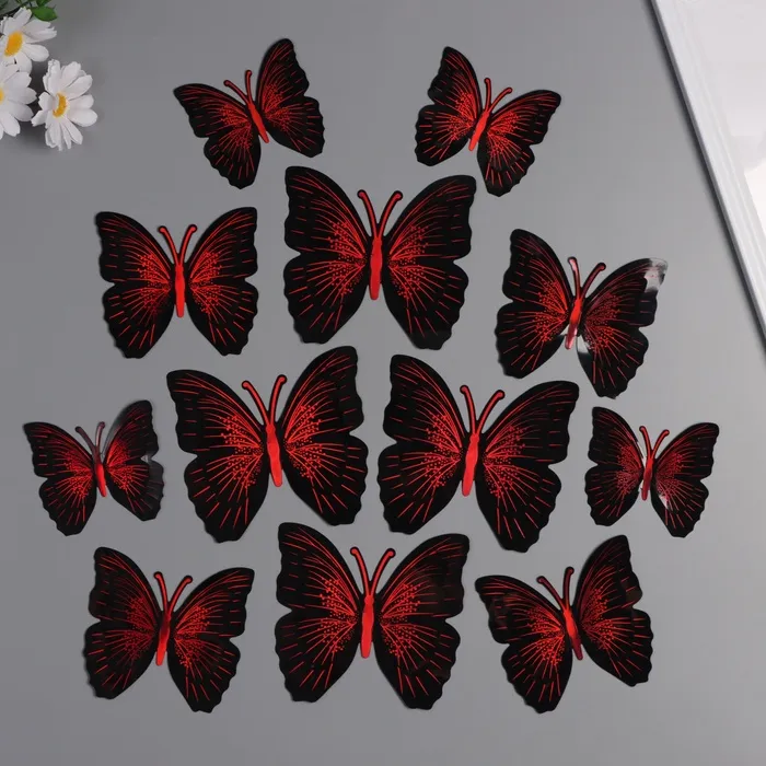 Наклейка пластик "Бабочки чёрные с красным" двойные крылья набор 12 шт 12 см, 10 см 8 см