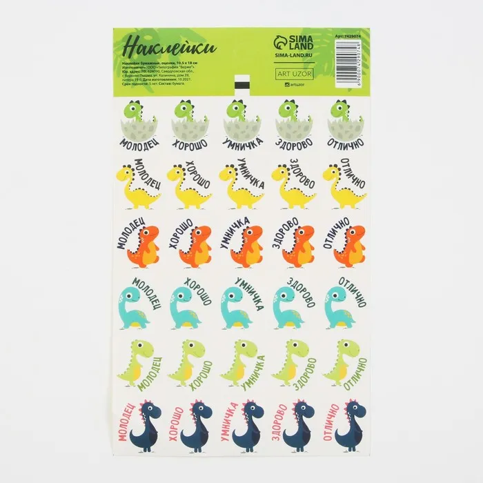 Наклейки бумажные оценки «Динозаврики», 10,5 × 18 см — Характеристики