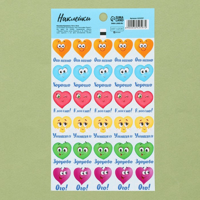 Наклейки бумажные оценки "Сердечки", 10,5 х 18 см — Характеристики