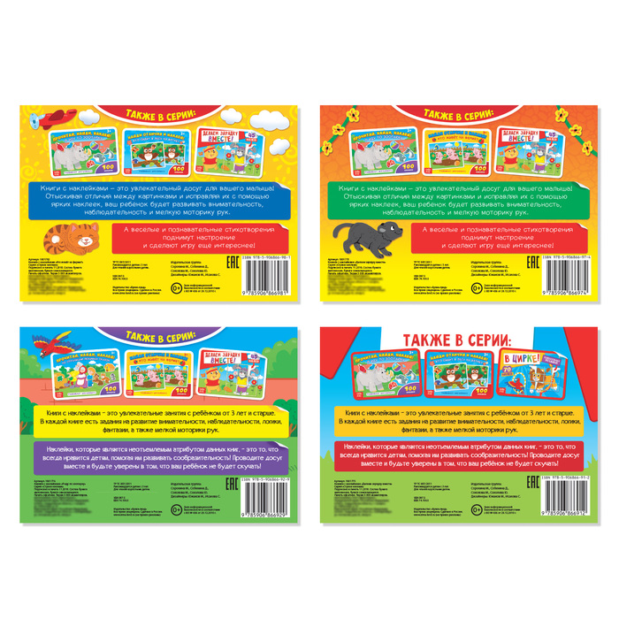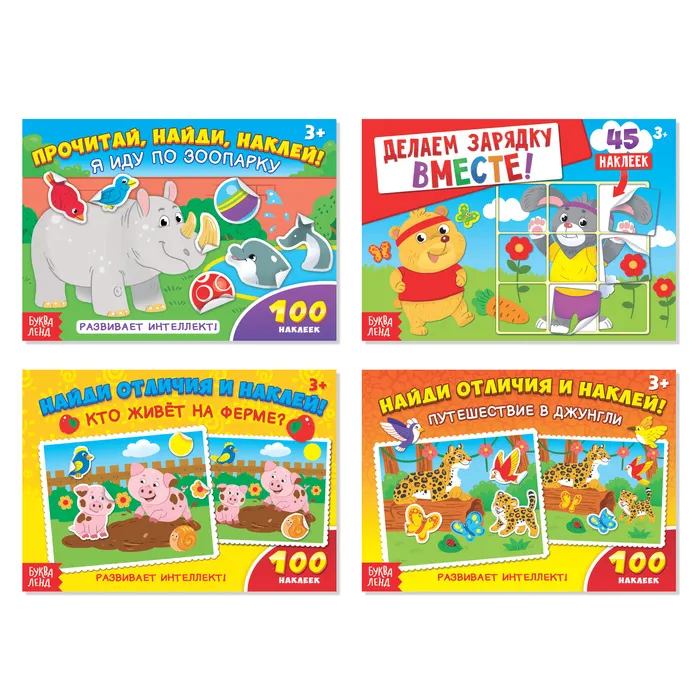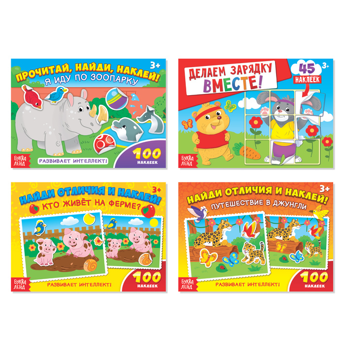 - В каждой книге из набора есть интересные задания и красочные наклейки, с помощью которых малышу предстоит выполнять эти задания.
