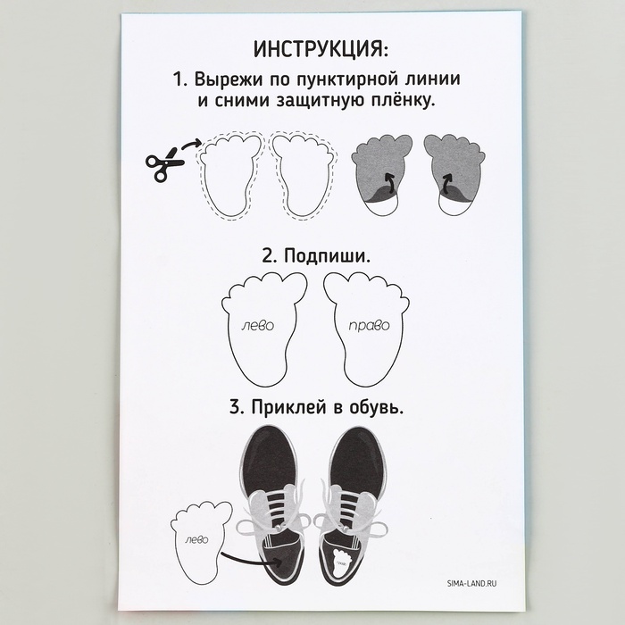 Напишите имя ребёнка капилярной ручкой или укажите какая сторона правая, а какая левая ( подождите пока надпись высохнет).Вырежьте бирку ножницами и снимите защитную плёнку с клеевой стороны.Приклейте бирку на выбранное вами место.Важно