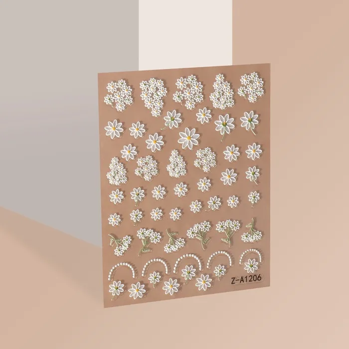 Изготавливаясь из качественных пластиковых и бумажных материалов, наклейки обладают эффектом 3D, что придаёт вашим ногтям выразительный и объемный вид. Белые цветы ромашек на фоне натурального оттенка создают яркий и свежий акцент, который станет отличным дополнением как к повседневному, так и к праздничному образу.