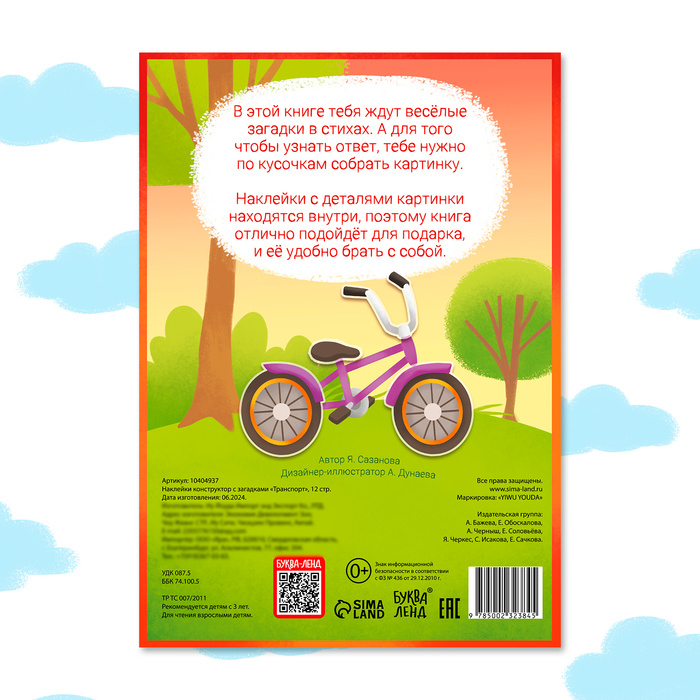 Наклейки конструктор «Транспорт», с загадками, 12 стр., более 40 наклеек, 3+ — Характеристики